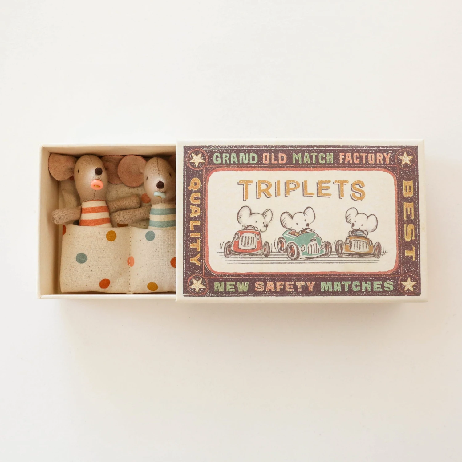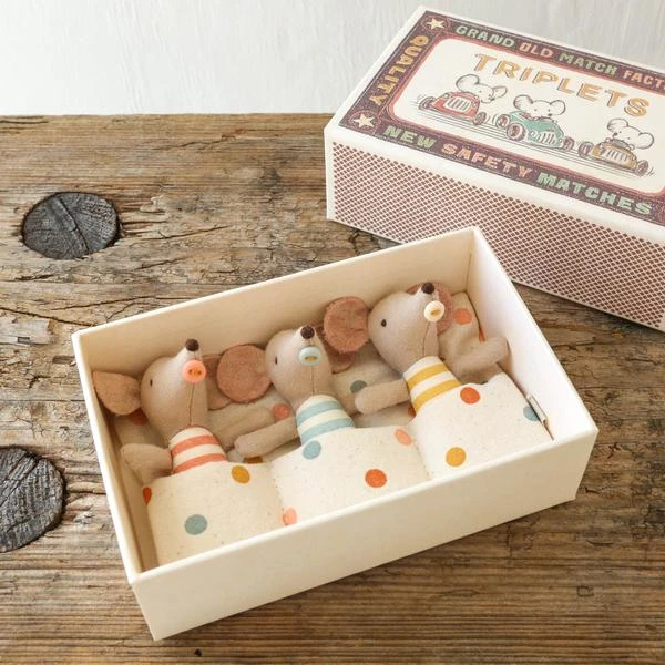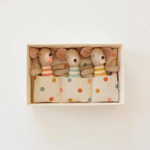 Now you can have 3 baby mice at the same time. The triplet baby mice are carefully tugged in their matchbox bed in a warm sleeping bag. They all have their own passifier and sleeps tight side by side. Maileg is a brand of charming Danish-designed toys created to inspire our children’s favorite playtime stories. By bringing storybook whimsy to everyday moments, Maileg toys help children explore the pure and simple wonder of imagination. Beloved for their heartwarming personalities, Maileg toys show playfulness and charm in every last detail. Theirs is a timeless world filled with beautiful accessories and settings to be collected, cherished and shared with friends and family for generations. 8cm high Ages 3+ Materials: Cotton Filling: Recycled Polyester Wash at 30°C