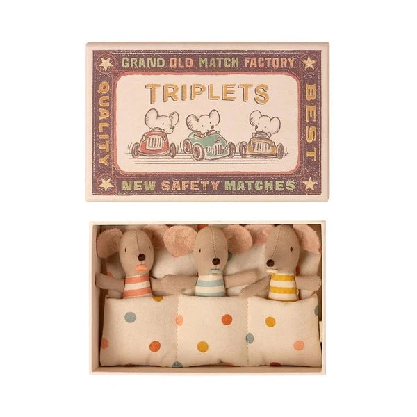 Maileg: Baby Mice – Triplets in a Matchbox. Now you can have 3 baby mice at the same time. The triplet baby mice are carefully tugged in their matchbox bed in the warm sleeping bag. They all have their own pacifier and sleeps tight side by side.Product details for Maileg: Baby Mice – Triplet In A Matchbox:Size : Baby mouseHeight : 8 cmAge: All agesWashing instruction: 30 degreesMaterial: CottonSee the rest of the collection here.