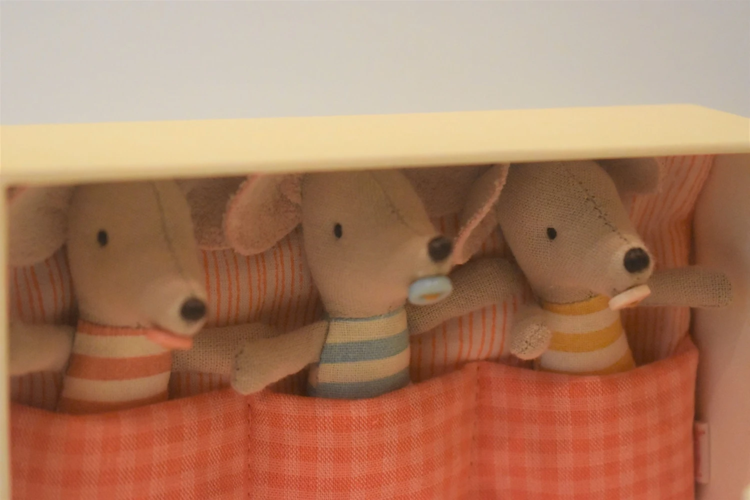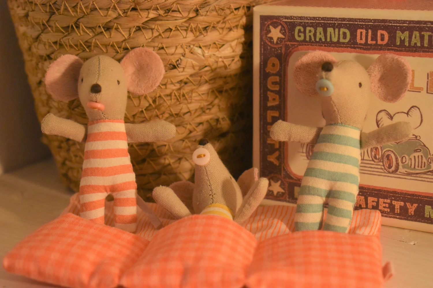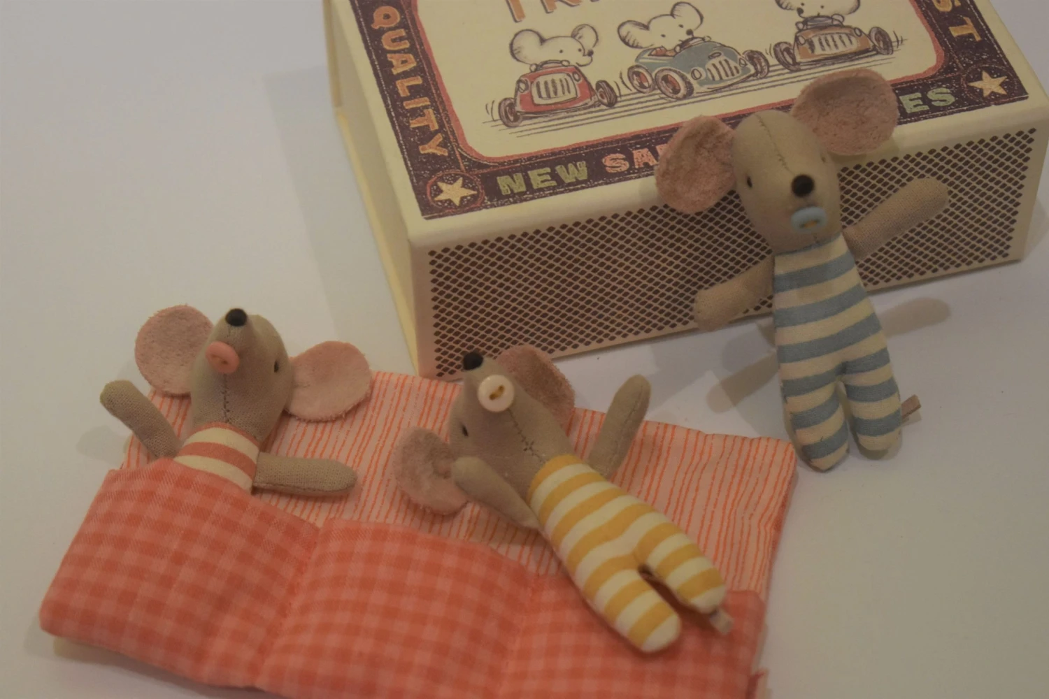 Meet these adorable baby mice triplets in their matchbox ready for sleep in their cosy triple sleeping bag! They love to play and have adventures in the day then snuggle up together back in their matchbox at bedtime.