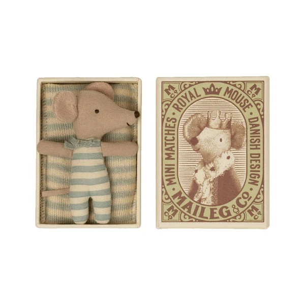Maileg: Baby mouse – Sleepy/wakey – Boy New Style. A classic Maileg item. This mouse is ready for hours of play and sleeps tight in his little matchbox. The clothes and bed linen are made of soft fabrics with unique prints and beautiful colours.Size : BABYHeight : 8 cmAge: 0-3 YRWashing instruction: 30 CMaterial: COTTONSee the rest of the collection here.
