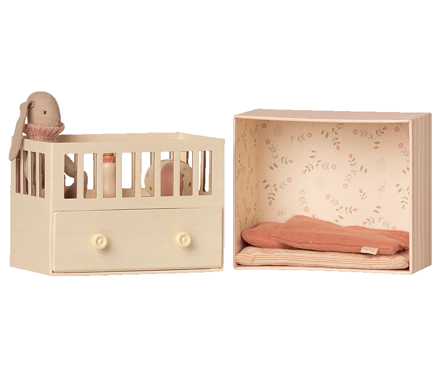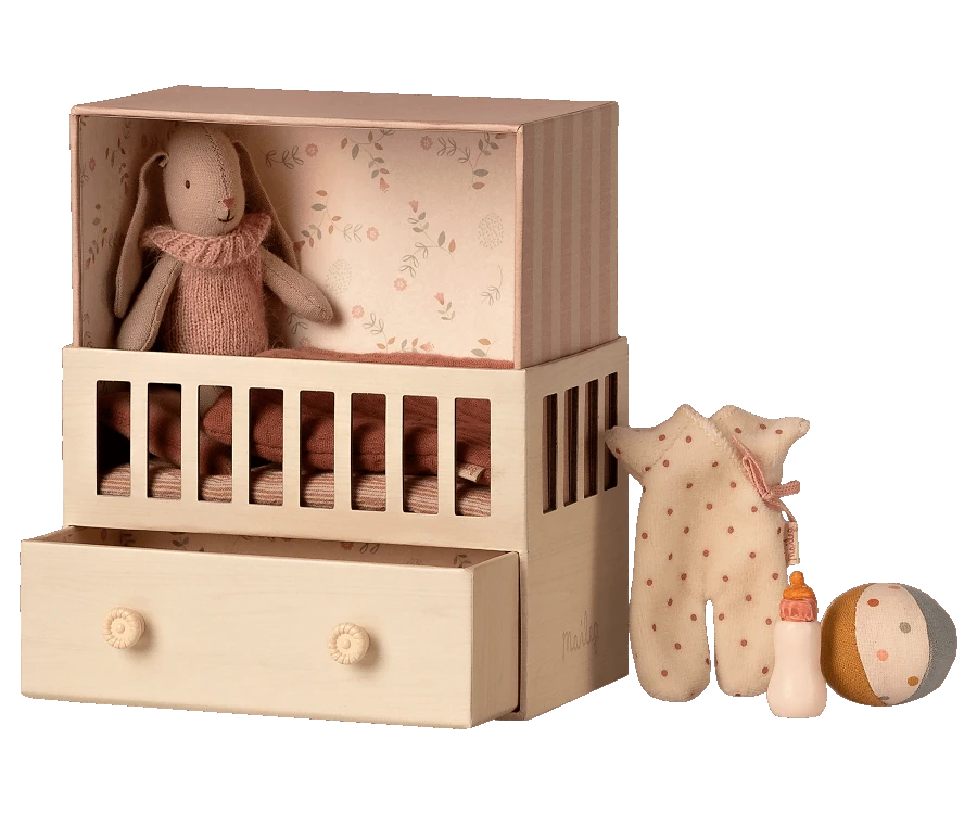 This sweet playful set contains a micro bunny, baby room box, baby suit, ball and a baby bottle. Everything you need for the perfect play and story telling about a baby. Add your favorite baby accessories to extend the story.