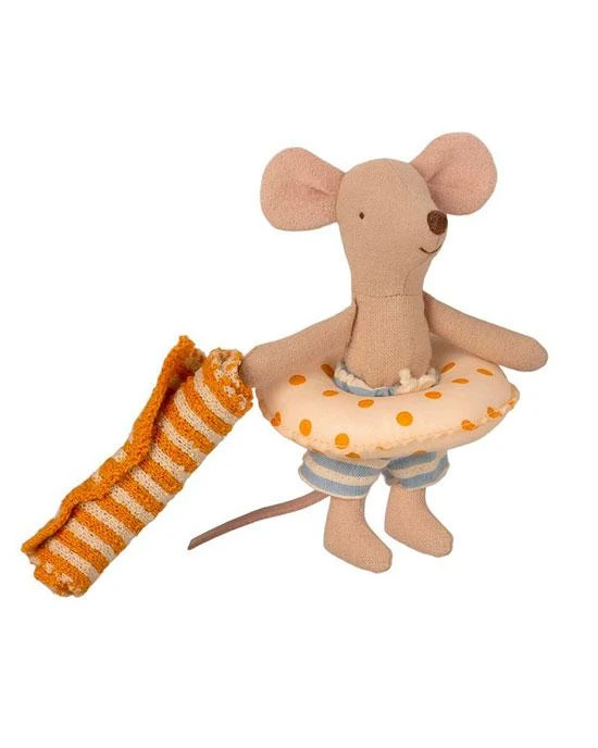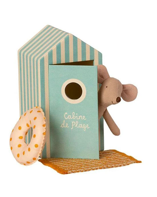 This wonderful beach collection from Danish brand Maileg will have you ready for a beautiful day at the seaside. This super sweet little mouse is wearing blue and white stripy swim shorts with delicate hand stitched features. He comes with a blue striped beach cabin made from reinforced cardboard which is perfect to store his towel and yellow spotty ring float in, once he’s finished playing in the sea! Size : Little brother mouse Height : approx 10 cm Washing instruction: 30 degrees Material: Cotton Suitable from 3 years About Maileg In a busy world of bright lights, bells and whistles, where new stories are continually impressed upon us… Maileg is a world in which matchboxes can be beds for mice; princesses make perfect teatime companions; and adventures can be found on a friendly forest walk. It is a world where cats and mice are friends. Ours is a world of childhood imagination – and this is a world we value. Maileg (pronounced My’lye) is a brand of charming Danish-designed toys created to inspire our children’s favorite playtime stories. By bringing storybook whimsy to everyday moments, Maileg toys help children explore the pure and simple wonder of imagination. Beloved for their heartwarming personalities, Maileg toys show playfulness and charm in every last detail. Theirs is a timeless world filled with beautiful accessories and settings to be collected, cherished and shared with friends and family for generations.