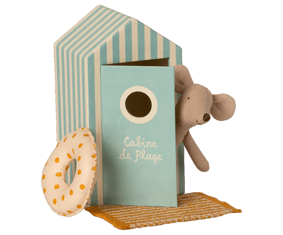 Die Mäuse machen heuer Strandurlaub. Mit diesem bezaubernden Strandset ist die Mini-Maus bestens gerüstet. Der kleine Bruder Maus ist mit einer hellblau gestreiften Badehose ausgestattet. Für alle Fälle hat er sein eigenes Strandtuch dabei und natürlich darf auch ein Schwimmreifen nicht fehlen. Verpackt ist das lustige Mäuschen in einem festen Karton in Strandkabinenform. Ein allerliebstes Spielzeug-Set das Groß und Klein erfreut. Altersempfehlung: +3 Jahre. Größe: Little Brother Höhe: 11 cm Material: Baumwolle Polyesterfüllung Karton.