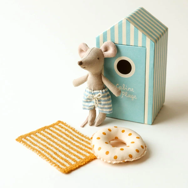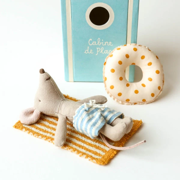Vacation time. This mouse ia ready for a day at the beach, with all needed accessories and a beautiful striped beach house. Maileg is a brand of charming Danish-designed toys created to inspire our children’s favorite playtime stories. By bringing storybook whimsy to everyday moments, Maileg toys help children explore the pure and simple wonder of imagination. Beloved for their heartwarming personalities, Maileg toys show playfulness and charm in every last detail. Theirs is a timeless world filled with beautiful accessories and settings to be collected, cherished and shared with friends and family for generations. Size: Little sister/brother Height: 11 cm Age: All ages Wash: 30°C Material: Cotton/Linen Filling: Polyester/Pe Pellets