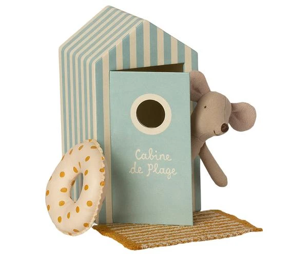 Size : Little sister / Little brother mouse Height : 11 cm Age: All ages Washing instruction: 30 degrees Material: Cotton / Linen This mouse ia ready for a day at the beach, with all needed accessories and a beautiful striped beach house. As he is the smallest family member he of course has a float to keep him safe. By Maileg.