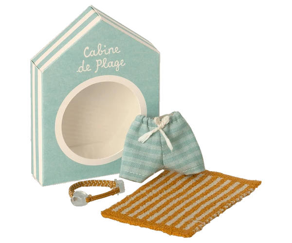 Size: Big sister / brother 3+ years Vacation time. This set include all essential accessories for a fun day at the beach: trunks, goggles and a towel. It all fits the mice in size big brother/sister perfectly.
