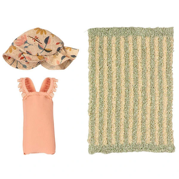 With this beach set for the Maileg big sister mouse, consisting of a bathing suit, sun hat and a beach towel, your Maileg mouse is completely ready for summer and a refreshing dip in the pool or the sea!