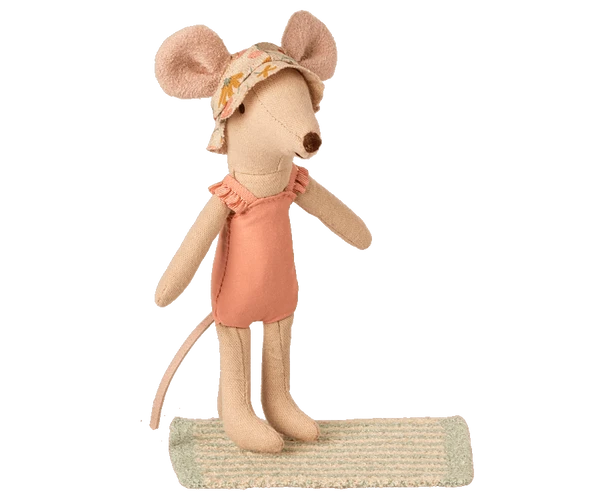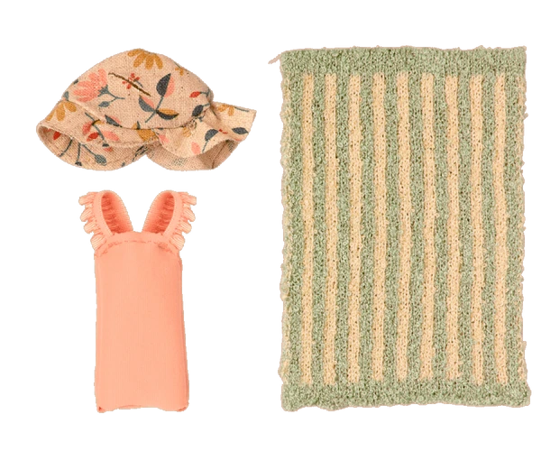Vacation time. This set includes all essential accessories for a fun day at the beach: a bathing suit, sunhat, and a towel. It all fits the mice in size big brother/sister perfectly. Item No.: 11-1304-00 Size: Big sister/ brother Recommended age: +3 Year Wash: 30°C Material: Linen/Cotton/Polyester Founded in 1999, Maileg is a Danish toy brand founded by illustrator and designer Dorthe Mailil. Known for their imaginative, playful toy designs that range from mice in matchboxes, to giant bunnies, alongside all the accessories and clothing to dress up her creations. The designs skilfully blend the Scandinavian aesthetic with the tradition of animal soft toys, making Maileg so popular amongst children and their parents. Mouse not included.
