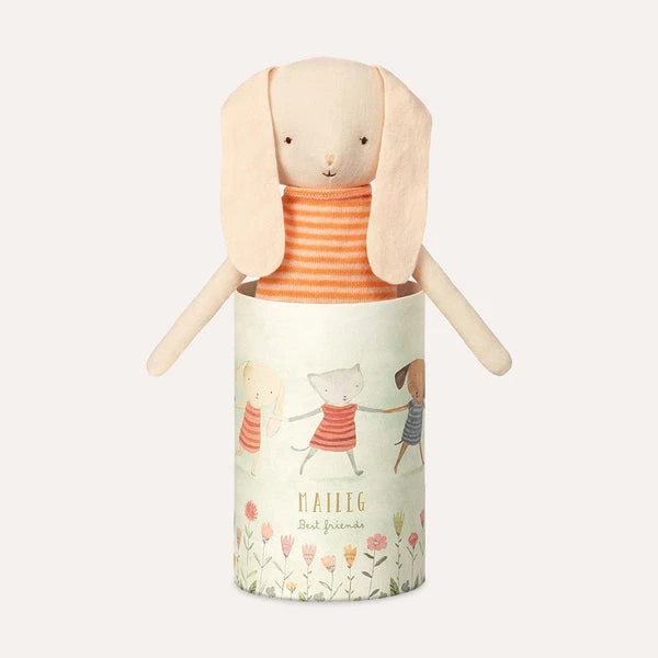 The perfect companion for little ones, this beautiful rabbit soft toy has a striped orange dress, and long floppy ears. Great for make believe adventures, and cuddling up at night for dreams of rolling hillsides and woodland friends. Best Friends Bunny Toy. Dimensions approx. 36cm (H). Made from linen.