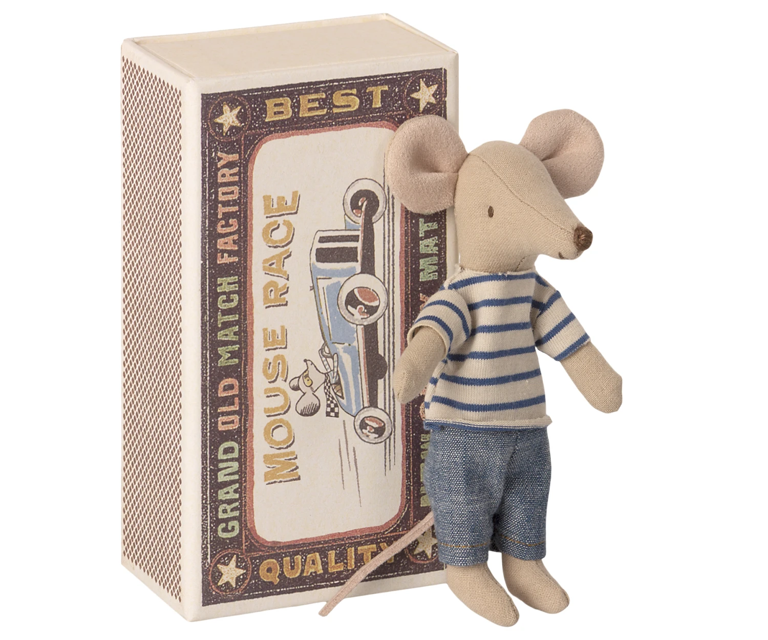Designed by award-winning Danish company Maileg, Big Brother Mouse has become a popular classic in this charming family of mice. This season, Big Brother Mouse enjoys a casual, rather nautical look with a blue and white stripy top and sporty linen trousers. With his own vintage-style matchbox bed for a home, complete with a tiny blue striped woollen blanket and spotty pillow, Big Brother makes a wonderful Scandinavian gift for any little boy or girl who loves imaginative play. Maileg mice are loved for the immaculate detail found in their beautifully crafted creations, for their timeless, nostalgic quality and their collectible appeal