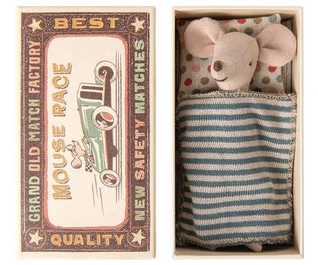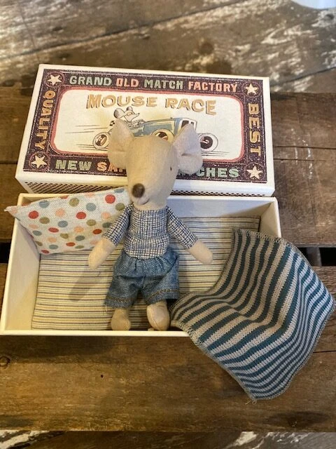 Big brother mouse in charming jean t-shirt and plaid outfit. Her matchbox bed has a colorful polka dot pillow, bedspread and striped blanket. Lovely to always have. It can be machine washed. The mouse is 12cm.