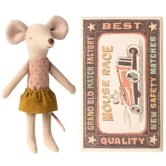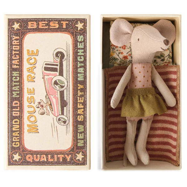 Meet the adorable big sister mouse in her matchbox by Maileg. She comes with her own matchbox bed, cotton mattress, pillow and soft blanket. She makes a perfect gift for any little boy or girl for hours of stimulating, imaginative play. Made from cotton & linen and suitable for ages 3+. Mouse is approx 13cm.