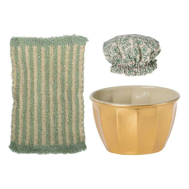 The mouse, bath, brush, sponge and charlotte set is delivered in a pretty cardboard “bathroom” box. A great gift idea.