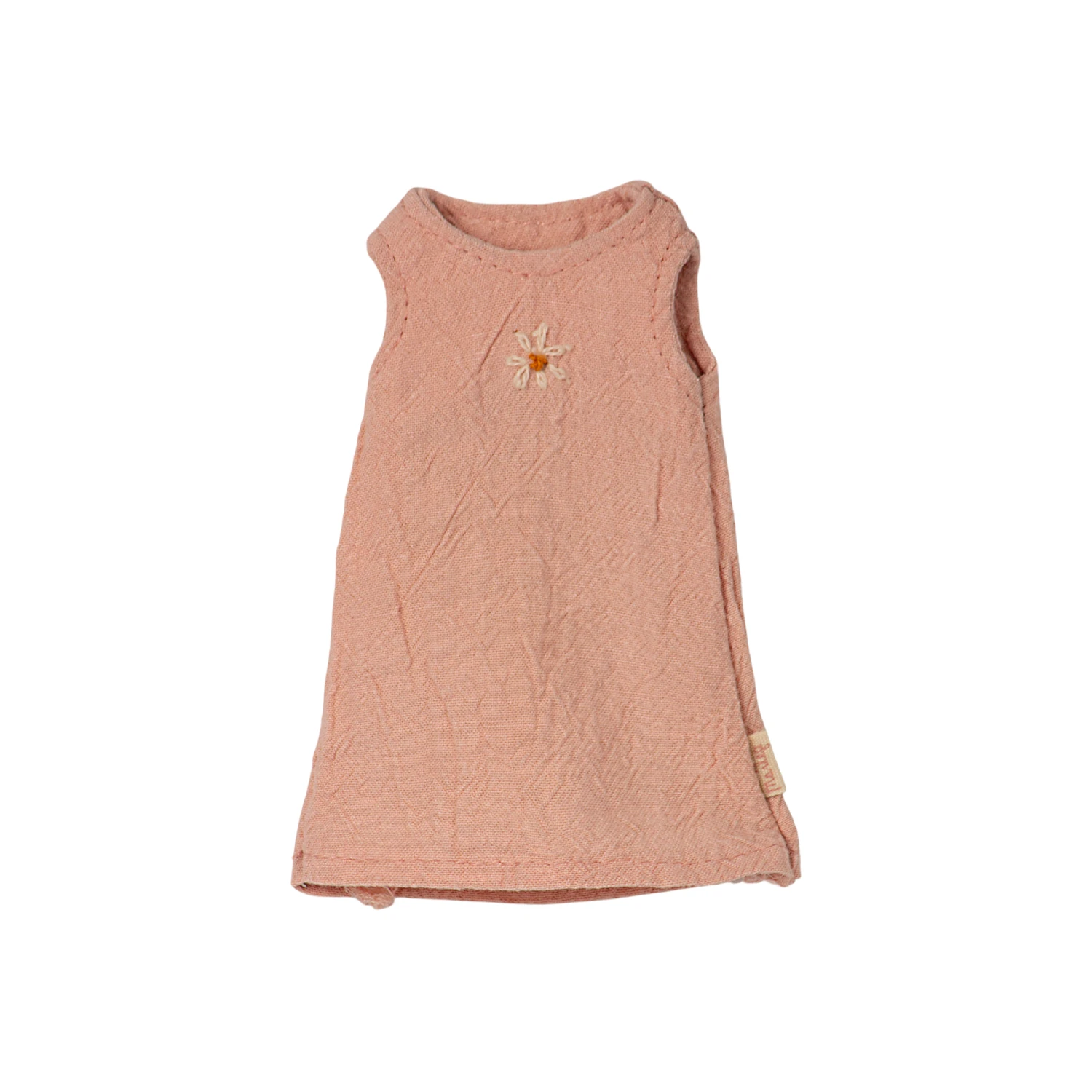 This adorable bunny is dressed in a sweet rose dress with a beautiful flower embroidered on the chest.
