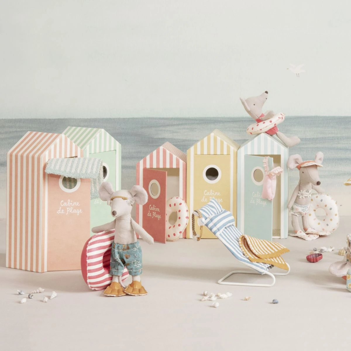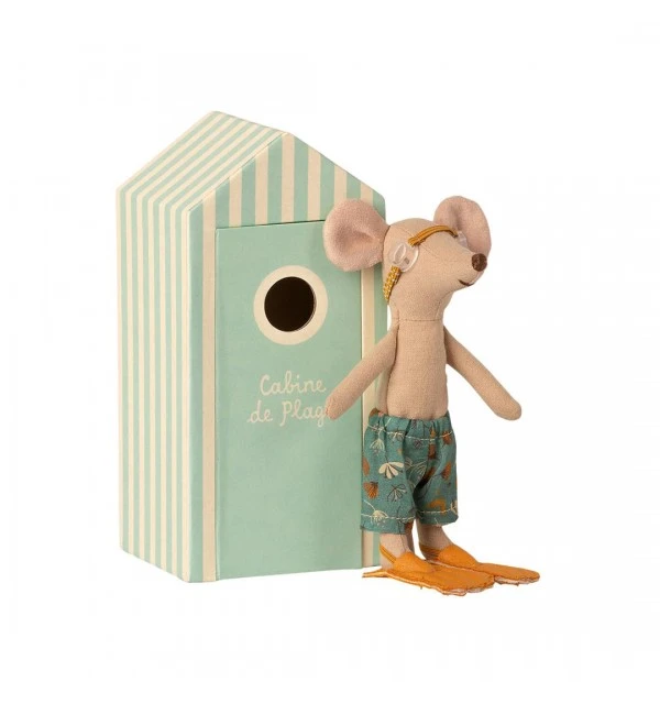 La nueva colección de verano de Maileg es encantadora. Tienen todos los detalles para disfrutar de un maravilloso día de playa. En este caso el hermano mayor tiene su cabina para cambiarse de cartón resistente en rayas azules y crema. El hermano mayor lleva un bonito bañador azul con flores estampadas además de su atuendo para bucear. Contiene aletas naranjas y gafas de buceo.