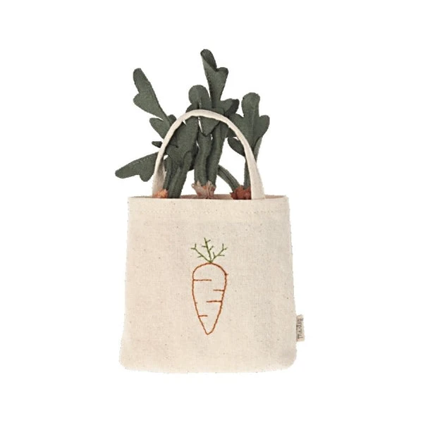 Maileg: Carrots In A Shopping Bag. All the rabbits’ & bunnies’ favourite snack. This little bag contains three carrots all in Maileg fabric. A sweet accessory that will encourage even more play. Dimensions: H14cm, W8cm Fits with Maileg Rabbit/Bunny Family size 1-5 Suitable for ages 3Yrs+ See the rest of the collection here.
