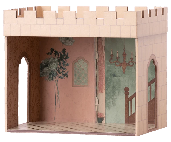This castle is a beautiful home for all mice. It is made of cardboard covered by unique Maileg prints. Use it as a small home for your mice or as a connecting hall for the two Maileg castles. Item No.: 11-1202-00 Size: Mouse Height: 25 cm Width: 29 cm Recommended age: +3 Year Wash: N/A Material: FSC Paper