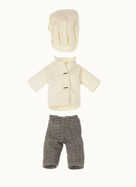 .A lovely playset with a chef mouse, soup pot, and spoon. Make dinner time a play with this sweet set. Match it up with Maileg kitchen collection and miniature food for the story to continue.