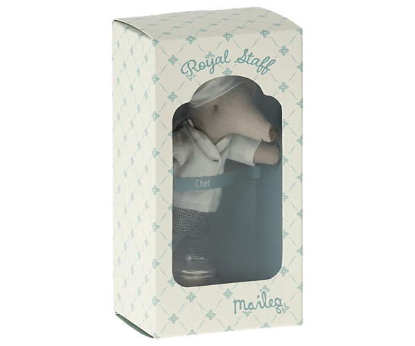 Mr Michelin Mouse – with his very own soup pot and spoon! He will cook for all your friends Maileg chef mouse Mr Michelin is a whizz in the kitchen. Dressed in his full chef regalia he loves to feed all your Maileg friends and throws lavish parties at his swanky restaurant. He’s always cheerful and knows all the best recipes. Material: Cotton Size: 12cm Suitable for 3+ years Hand washable at 30 degrees Maileg mice are made from natural materials and to a very high standard, so make great keepsakes and are perfect to hand down to the next generation