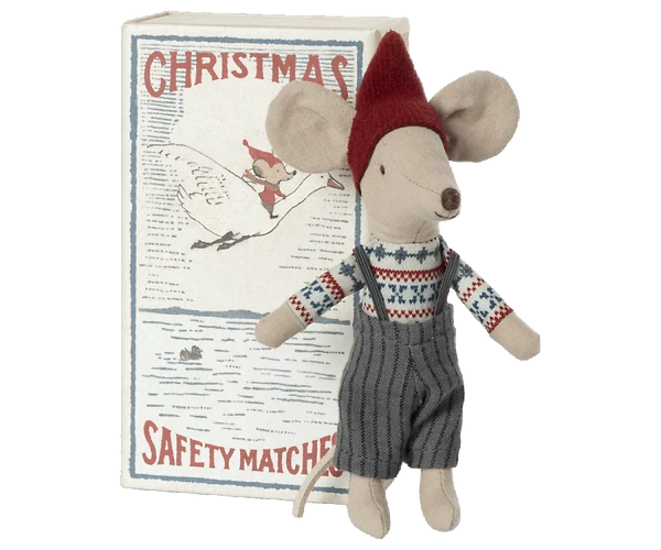 Big Brother mouse is ready for Christmas with his Fair Isle patterned top and braces! Tuck him up tight in her little matchbox, with super soft bedlinen, he’s all ready for a cosy night’s sleep waiting for Father Christmas! Size : Big sister / Big brother mouse Height : 16 cm Age: All ages Washing instruction: 30 degrees Material: Cotton / Linen Pleas note – fabrics may vary Your Maileg mouse will become a truly treasured toy. These beautiful mice are a mix of Scandinavian design and old fashioned nostalgia. The mice are made from cotton, linen and even have a leather tail. These timeless toys are ideal for handing down for the next generation to love.