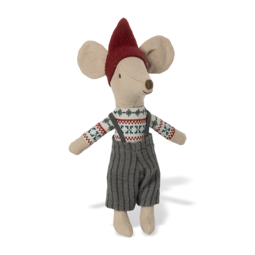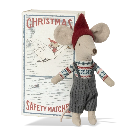 Designed by award-winning Danish company Maileg, Big Brother Christmas Mouse is one of the latest additions to the family for this season. Warmly dressed in his best pin-striped dungarees over a Nordic-style winter shirt and cosy red bobble-hat, he is very ready for the festive party season. Christmas Mouse has his own matchbox for a bed, complete with a grey cable-knit blanket and stylish linen mattress and pillow. Beautifully crafted from cotton and linen, Maileg Christmas Big Sister Mouse has that same timeless, nostalgic quality that makes all Maileg toys gifts to treasure.