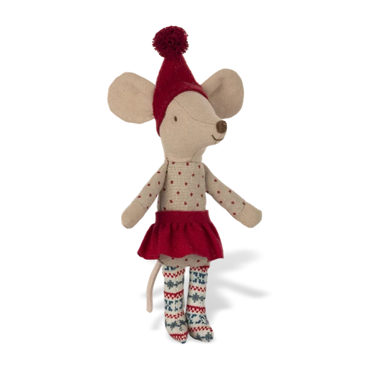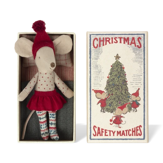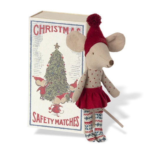 Designed by award-winning Danish company Maileg, Big Sister Christmas Mouse is one of the latest additions to the family for this season. Warmly dressed in her best red knitted skirt over woolly tights and cosy red bobble-hat, she is ready for the festive party season. Christmas Mouse has her own matchbox for a bed, complete with a grey cable-knit blanket and stylish red linen mattress and pillow. Beautifully crafted from cotton and linen, Maileg Christmas Big Sister Mouse has that same timeless, nostalgic quality that makes all Maileg toys gifts to treasure.