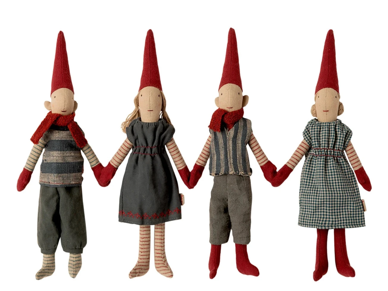 A climbing pixy boy or girl wearing warm festive clothes, ready to celebrate Christmas.