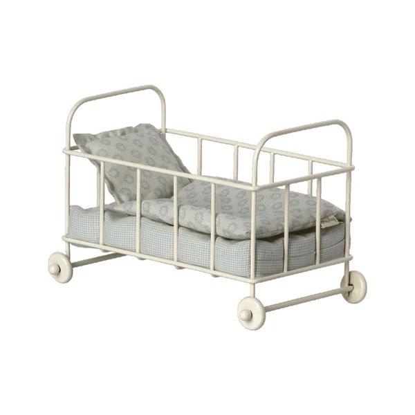 Maileg: Cot Bed, Micro – Blue. A cosy cot bed made of metal, it comes with a mattress, blanket, and pillow. You can tuck in your micro sized friends as well as the small mice.Size : MicroWidth: 16 cmAge: 3 yrWashing instruction: Surface WashMaterial: Metal/CottonSee the rest of the collection here.