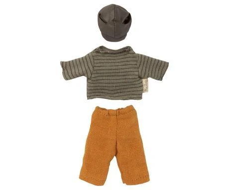 Casual trousers, a hat and a soft striped sweater for Dad mouse Founded in 1999, Maileg is a Danish toy brand founded by illustrator and designer Dorthe Mailil. Known for their imaginative, playful toy designs that range from mice in matchboxes, to giant bunnies, alongside all the accessories and clothing to dress up her creations. The designs skilfully blend the Scandinavian aesthetic with the tradition of animal soft toys, making Maileg so popular amongst children and their parents. Product details Item number 16-0745-02 Size : Big sister / Big brother mouse Height : 1,5 cm Age: 3 years & up Washing instruction: 30 degrees Material: Cotton / Linen Boxed. Mouse not included.