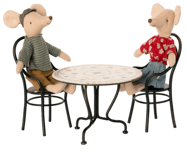 Height:8 cm Width:12 cm Recommended age:+3 years Wash:Surface wash Material:Metal Invite your friend for Sunday supper at the dining table. The set contains a round table and 2 metal chairs.