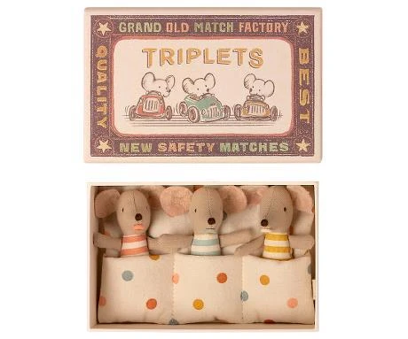 Triplets, Baby Mice in Matchbox Jetzt können Sie 3 Babymäuse gleichzeitig haben. Die Triplett-Babymäuse werden vorsichtig in einem warmen Schlafsack in ihrem Streichholzschachtelbett gezogen. Sie schlafen alle eng nebeneinander. Größe: Babymaus Höhe: 8cm Alter: Alle Altersgruppen Waschen: 30 Grad Material: Baumwolle