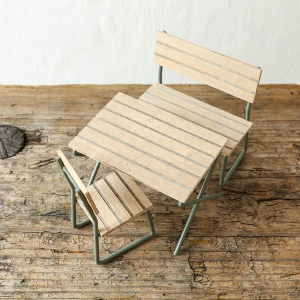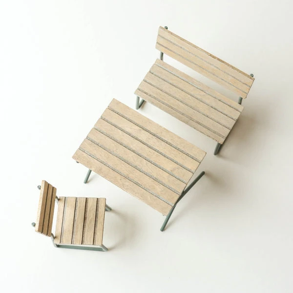 This garden furniture set for the Maileg mice comes with a bench seat, chair and table. Maileg is a brand of charming Danish-designed toys created to inspire our children’s favorite playtime stories. By bringing storybook whimsy to everyday moments, Maileg toys help children explore the pure and simple wonder of imagination. Beloved for their heartwarming personalities, Maileg toys show playfulness and charm in every last detail. Theirs is a timeless world filled with beautiful accessories and settings to be collected, cherished and shared with friends and family for generations. Size: Mouse Height: 8 cm Width: 9 cm Age: 3 YR + Wash: Surface wash Material: FSC Wood / Metal