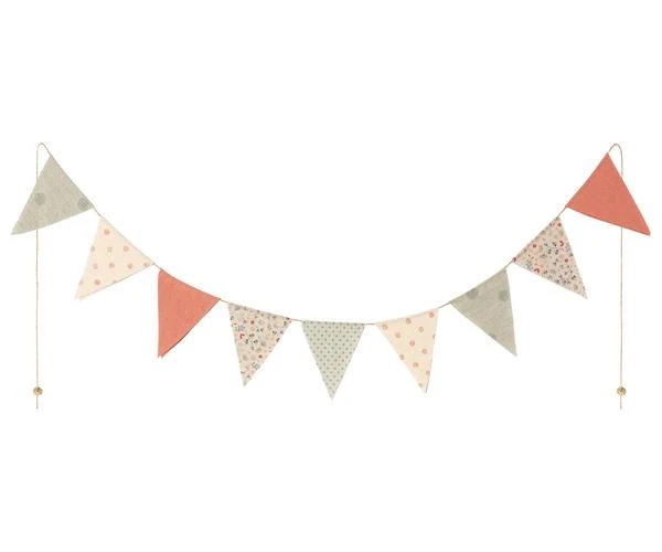Length: 175 cm 9 flags 9 x 11 cm Machine washable 30 degrees materials: Cotton and linen This pretty Multi colour garland / bunting by Maileg can be used to decorate your child’s room all year round or for parties and special occasion. It has 9 assorted Maileg print flags sewn on a gold elastic string.