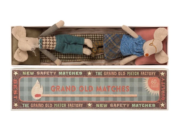 Grandma and grandpa mouse come in their grand old matchbox that is furnished with a mattress, pillow, and blanket. Height 17 cm.