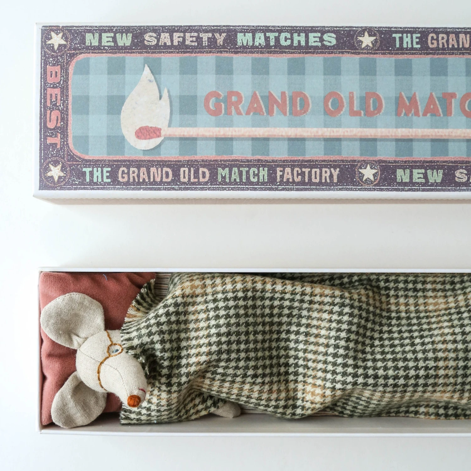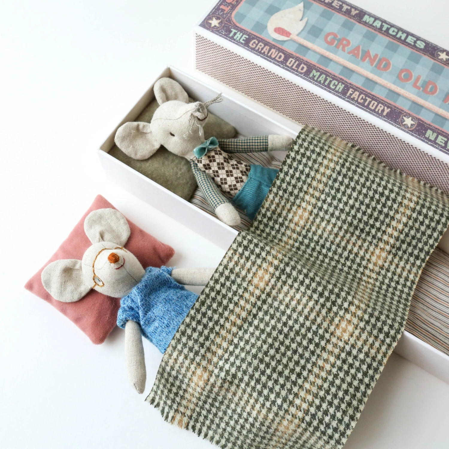 We all love our mum and dad, but everyone knows it is grandma and grandpa who really love to spoil the kids! Grandma and grandpa mouse come in their grand old matchbox that is furnished with a mattress, pillow, and blanket. Size: Mother/Father mouse Height: 17 cm Age: All ages Wash: 30°C Material: Cotton/Linen Filling: Recycled polyester/Pe Pellets