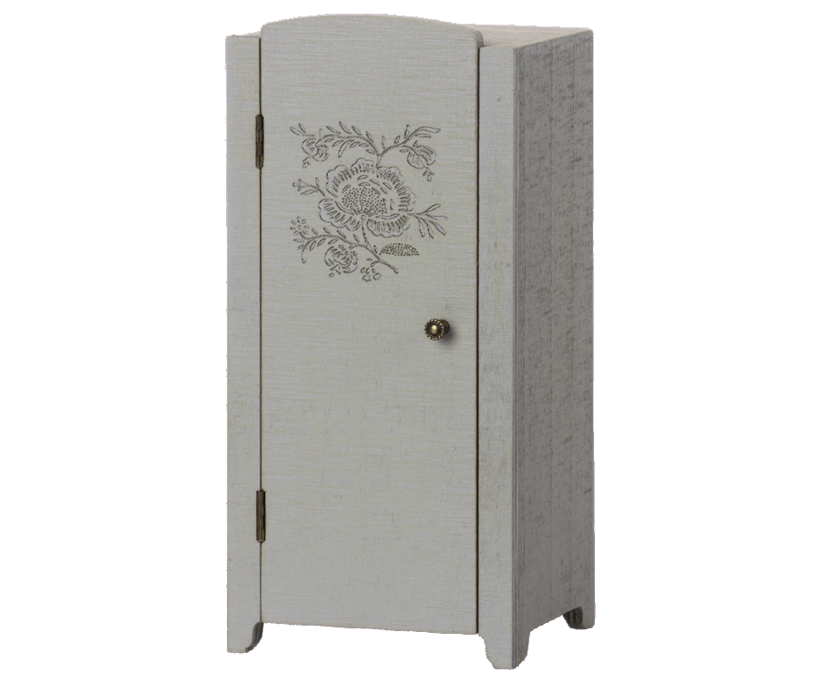Ce placard au look vintag a un bel imprimé de fleurs en relief sur le devant et un beau papier paint imprimé à l’intérieur. Ce placard d’intègre dans la maison de poupée Maileg.
