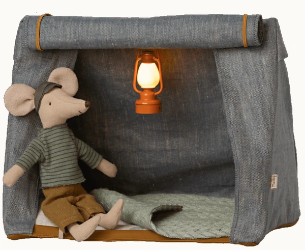 Take your mice along for a sleep-over under the stars in the easy fold-up tent. The blanket will keep your friends warm during the night. The outer fabric has a coated surface for a more authentic look.