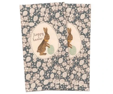 Pack of 16 napkins in each pack. There are two packages, in total there are 32 Maileg brand paper napkins. A beautiful pack of blue napkins printed in cream color and with a cute brown Easter bunny. Celebrate the Easter snack with these beautiful napkins.