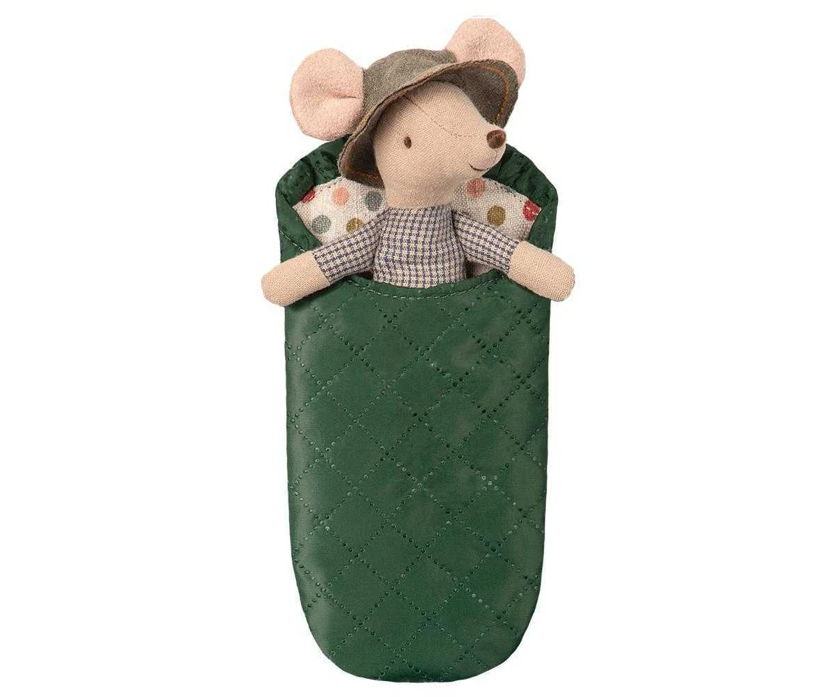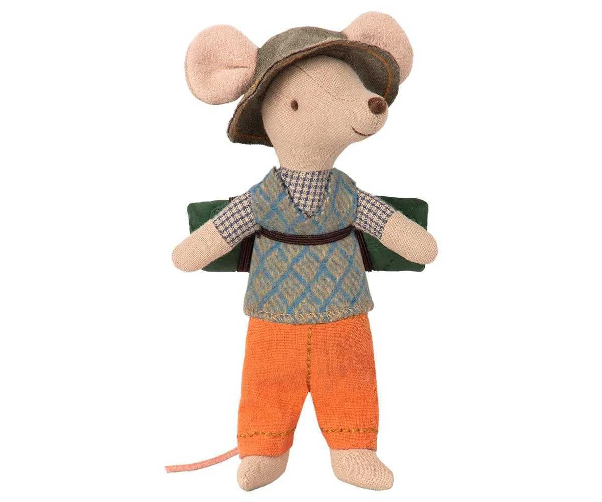 Mouse hiking, big brother Maileg. Ain’t no mountain high enough. Hiker boy will spend days in the wilderness with her sleeping bag, blue dress and fashionable bandana Height : 12 cm. Washing instruction: 30 degree c. Material: Cotton/Linen.