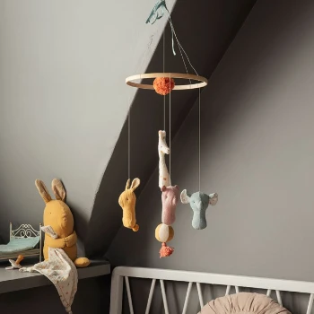 Lullaby friends is a collection with beautiful baby items. This mobile is perfect for the baby to look at from the bed or from the nursery table. The animals are made in soft fabrics with unique prints and are packed in a beautiful gift box.