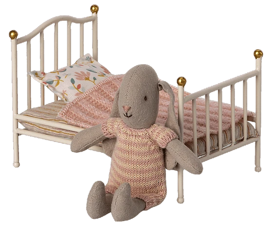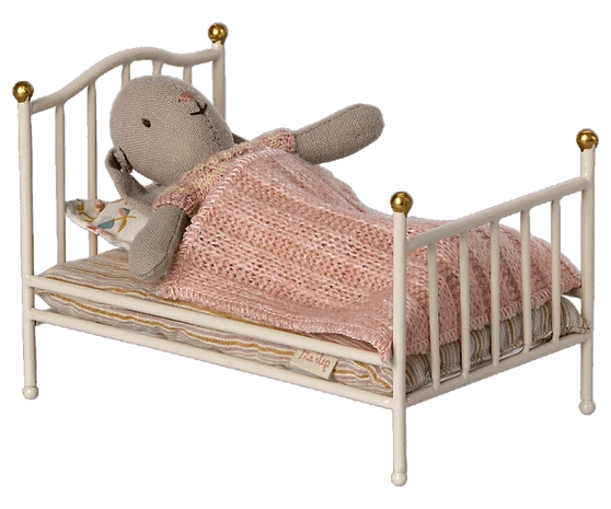 Laissez vos amis Maileg dormir dans le lit en metal vintage. Il est livre avec un matelas et un oreiller fabriques dans nos magnifiques tissus imprimes Maileg. Sur le dessus, une couverture tricotee gardera les petits amis au chaud. Il sadapte parfaitement aux petites souris.