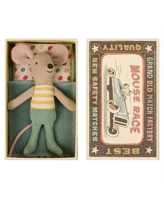 Oh! Just look at the little brother mouse, with delightful details from nose to tail. He lives in his matchbox and sleeps on cute bedding. His ears are fuzzy and soft, and he is dressed in yellow stripes and teal pants. Size : Little sister / Little brother mouse Height : 10 cm Age: All ages Washing instruction: 30 degrees Material: Cotton About Maileg In a busy world of bright lights, bells and whistles, where new stories are continually impressed upon us… Maileg is a world in which matchboxes can be beds for mice; princesses make perfect teatime companions; and adventures can be found on a friendly forest walk. It is a world where cats and mice are friends. Ours is a world of childhood imagination – and this is a world we value. Maileg (pronounced My’lye) is a brand of charming Danish-designed toys created to inspire our children’s favorite playtime stories. By bringing storybook whimsy to everyday moments, Maileg toys help children explore the pure and simple wonder of imagination. Beloved for their heartwarming personalities, Maileg toys show playfulness and charm in every last detail. Theirs is a timeless world filled with beautiful accessories and settings to be collected, cherished and shared with friends and family for generations.