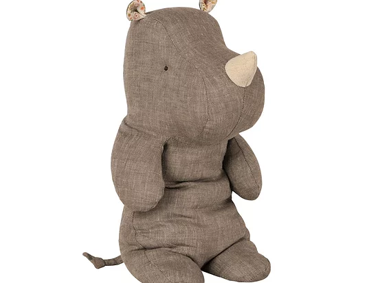 Gray rhino soft toy from the Safari Friends collection by Maileg. Holds alone in a seated position. Height: 30cm. Composition: Linen and polyester.