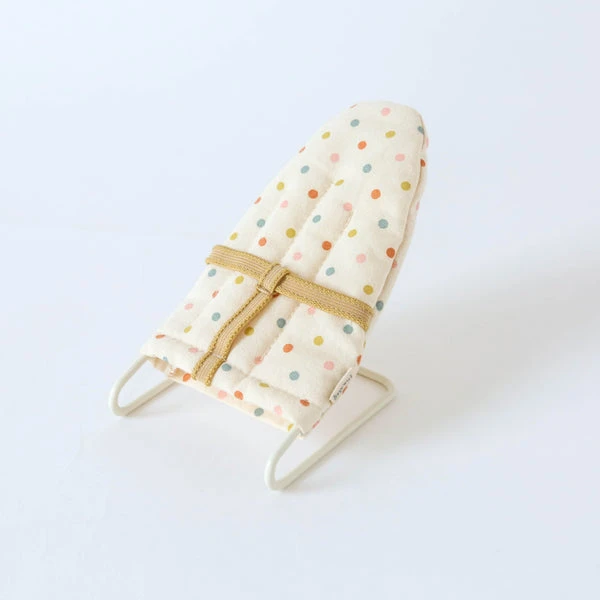 With this baby sitter it is easy to bring your little friends to sleep. The base is made of metal and covered by the most lovely dotted fabric. The chair fits the baby mice and micro sized rabbits and bunnies perfectly. Size: Micro Height: 9 cm Age:+3 Year Wash: Surface wash Material: Metal/Cotton