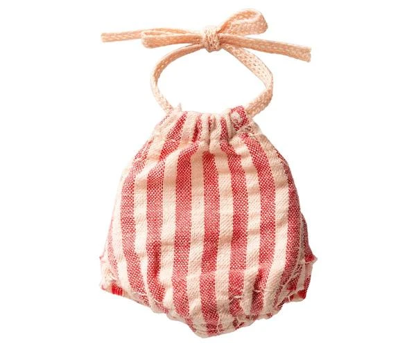 Size : Micro Height : 13 cm Age: 3 years & up Washing instruction: 30 degrees Material: Cotton / Linen This sweet bunny by Maileg wears a fully removable little halterneck stripy playsuit. She is all ready to play in the springtime!