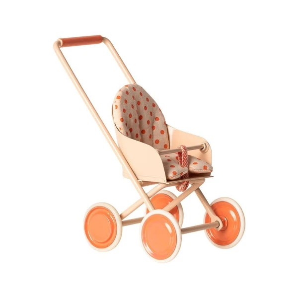 Maileg: Micro Stroller – Soft Coral. This quirky little stroller can be used for a lot of the Maileg friends. The beautiful design represent a vintage look and the fabric and colour details, make the product a must-have.The Stroller is a great addition to the Maileg Dollhouse or to play with on it’s own.Product detailsHeight : 12 cmAge: 3 years & upWashing instruction: Surface washMaterial: Metal / CottonSee the rest of the collection here.