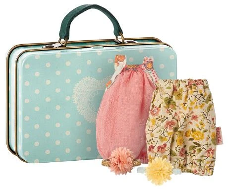 Working miniature suitcase. Beautifully made and fully lined with matching pattern. Comes with two different dresses and headbands that your Maileg friend will love! Micro sized clothing can fit micro bunnies and big sister mice. Height : 2.76 in. Washing instruction: 30 degree c. Material: Cotton-Polyester.