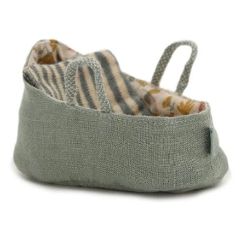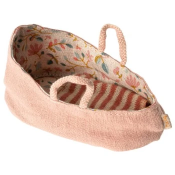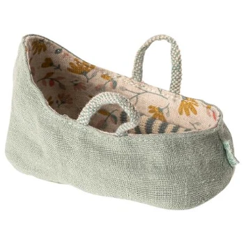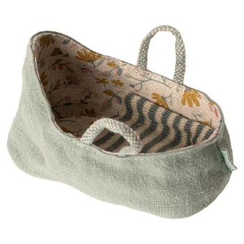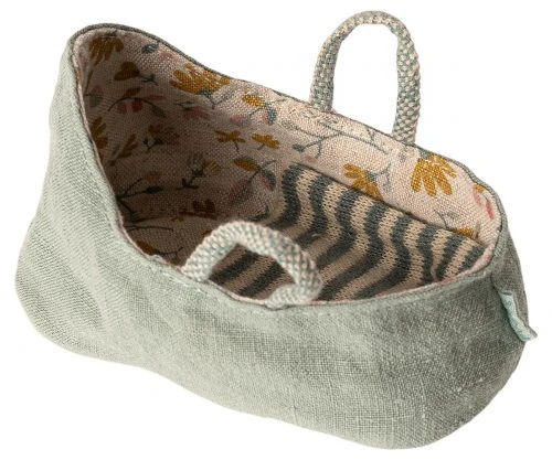 Your little Maileg friend can curl up under the striped blanket in this carrycot and take a short nap in this attractive carrier. The inside of the carrycot is decorated with a nice flower print and is easy to hold by its two handles.