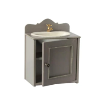 A beautiful vintage metal sink with a golden water tap. The sink comes in a wooden closet which has the most beautiful paint details and fullfill the old vintage look.