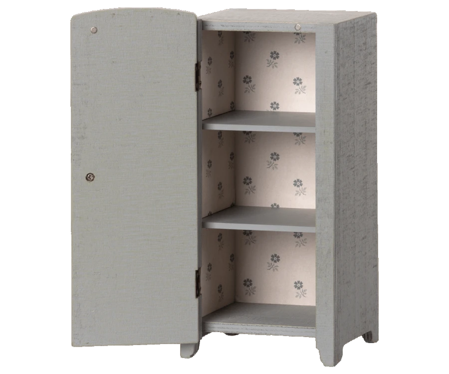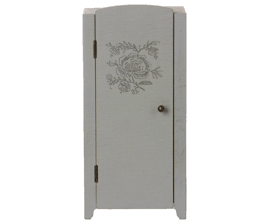 This vintage looking closet has a beautiful embossed flower print on the front and beautiful printed wallpaper inside. The shelves inside will make sure the organising play will begin. This closet fits into the Maileg dollhouse. H: 23cm x W: 11cm. Not suitable for children under 36mths. Materials- FSC wood. Wipe clean only.